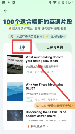 3、进入100个适合精听的英语片段详情页,在未学分类下选择要精听的片段开始学习。