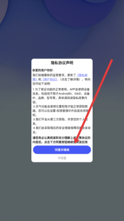 1、打开万能空调遥控器App,在隐私协议说明弹窗点击同意并继续,接受协议进入应用主界面。