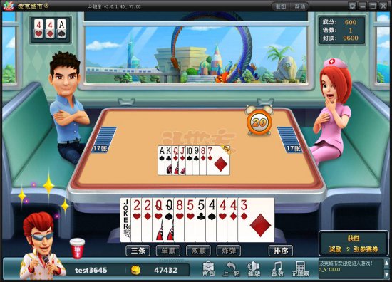 斗地主是一款非常常见的扑克游戏,一直很火爆,相信大家都玩过。斗地主类型众多,各地方的玩法都不同。下面小编为大家带来的是,波克城市斗地主,游戏玩法简单,娱乐性强,老少皆宜。斗地主对抗性和配合性都很强,用一副牌共54 张牌。每局牌有一个玩家是“地主”,地主为一方,其余两家农民为另一方,双方对战,地主的目标是(以合法的出牌方式)先出完手里所有的牌,而农民的目标是在地主出完牌以前,先出完手里所有的牌。先出完牌的人所代表的一方获胜。
