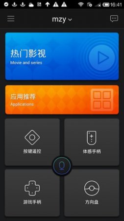 点击左边的三杠就可以看到手机控制天猫盒子一些功能:按键遥控器,触摸遥控器,赛车模式,游戏手柄这些控制性的功能。根据自己的需求去一一的使用吧!