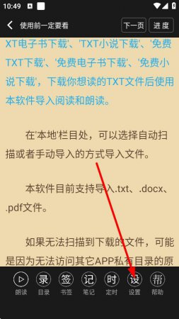 3、在文档阅读界面,点击屏幕调出功能栏,接着点击设置选项。