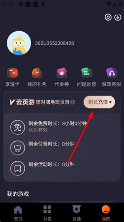 2、在个人中心页面,找到V云页游 随时随地玩页游区域,点击时长充值等操作可能触发实名认证弹窗。