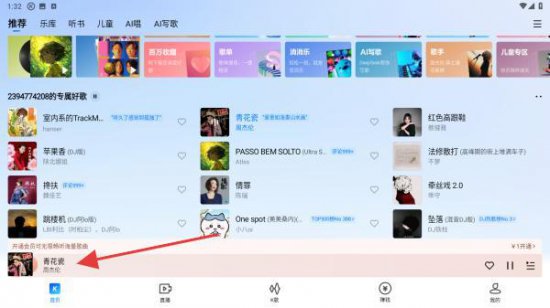 1、在推荐的页面内,用户可找到想要听的歌,点击即可开始播放。