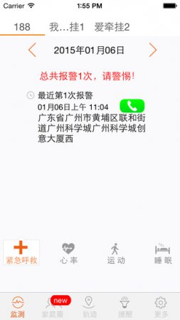 老人佩戴的爱牵挂腕表设有SOS紧急呼救键,遇险时主动按下SOS紧急呼救键直接通知家人。同时,爱牵挂腕表具有伤害判定功能,根据心率以及身体动作数据,通过紧密算法判定老人的受伤害状况,即使不能主动呼救,也能自动启动发出呼救。