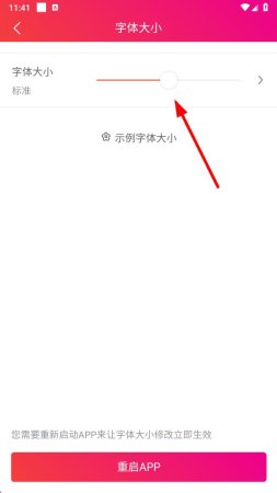 4、在字体大小调整界面,通过拖动进度条来选择合适的字体大小,完成后点击重启APP,即可让修改的字体大小生效。