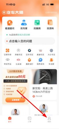1、打开汽车大师APP,在首页点击右下角我的选项。