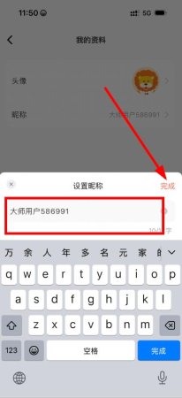 4、在弹出的设置昵称输入框中,输入新的昵称,然后点击完成按钮,即可完成名字修改。