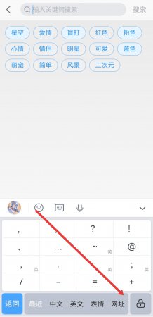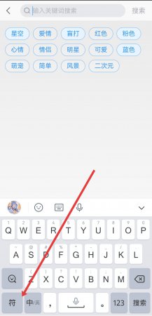 1、在QQ输入法界面如输入框唤起后的键盘页,点击左下角符按钮,进入符号选择页面。