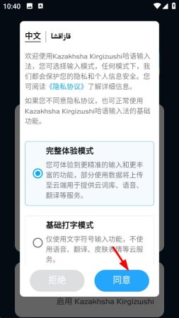 1、打开哈萨克语输入法应用Kazakhsha Kirgizushi,在弹出的隐私协议界面选完整体验模式或基础打字模式,再点击同意按钮。