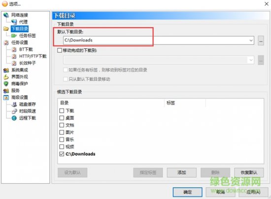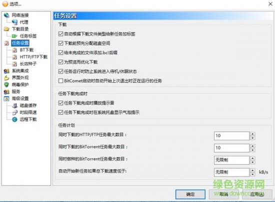 第一步:打开BitComet,点击“Ctrl+P”,弹出“选项”对话框,选择“任务设置”,将默认的下载目录由“C:Downloads”改为自己专用的下载目录。