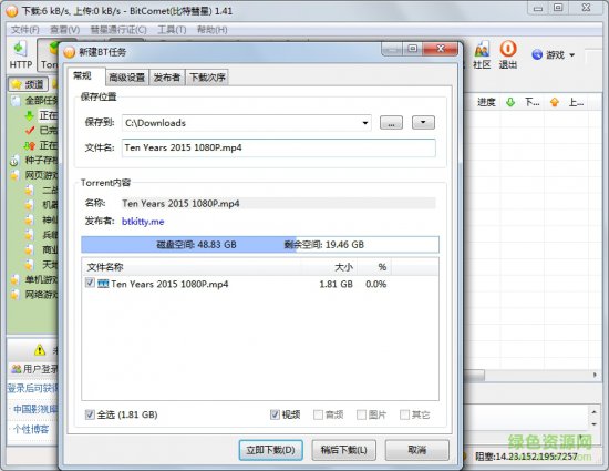 1.普通下载:点击右上角“Torrent”图标,打开torrent文件,选择下载位置,点击“确定”,即可开始下载;