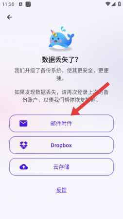 3、在数据丢失了页面,选择恢复数据的来源如邮件附件,进入对应恢复流程说明页。