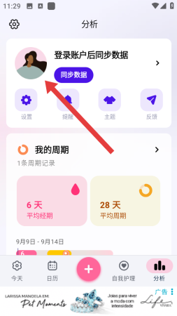 1、打开小月历APP,进入分析页面,点击登录账户后同步数据区域,进入数据备份和恢复界面。