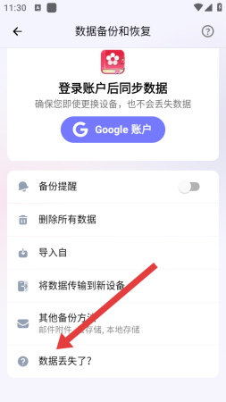 2、在数据备份和恢复页面,点击数据丢失了选项,进入数据恢复途径选择界面。