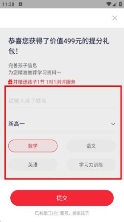 3、验证码输入完成后,进入提分礼包领取页面,输入孩子姓名,选择孩子年级和学科等信息。