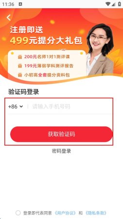 1、打开教育类软件,进入登录界面,在验证码登录区域输入手机号码,然后点击“获取验证码”按钮,等待验证码发送。