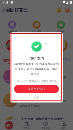 4、信息填写完成后,点击“提交”按钮,即可成功领取提分礼包,页面会提示预约成功,稍后有课程顾问老师联系安排测评服务。