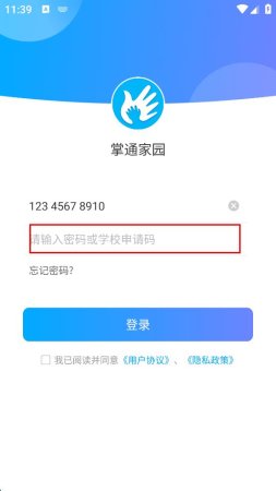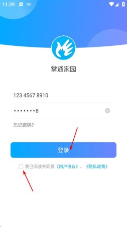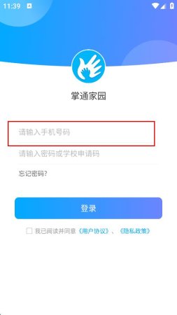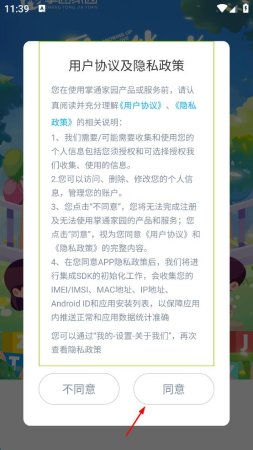 1、打开掌通家园APP,会弹出用户协议及隐私政策弹窗,仔细阅读相关内容后,点击“同意”,进入登录页面。