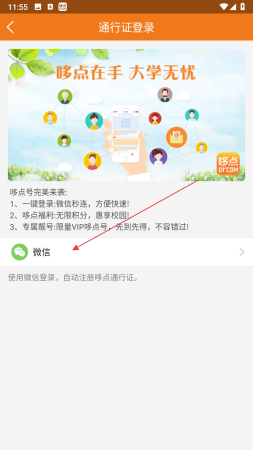 3、在通行证登录页面看到微信登录方式,点击微信图标,在弹出的授权界面确认授权,即可完成哆点账号登录。