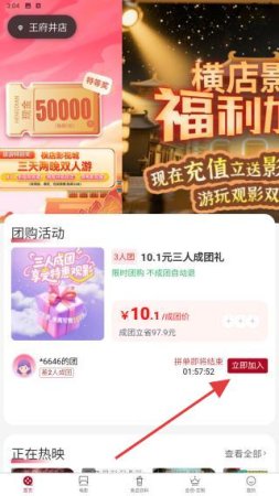 1、打开横店电影城APP,进入到首页内,在团购活动下点击立即加入。