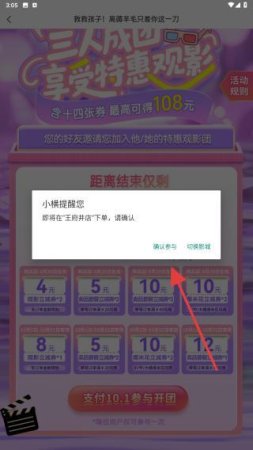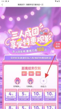 2、三人成团,享受特惠观影,点击待助力的区域。
