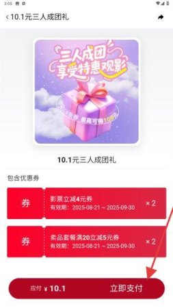 4、参与后,需要支付10.1元即可购买电影票,点击立即支付即可。