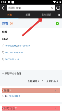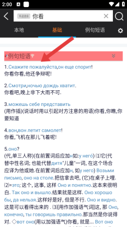 3、在词条详情页面,可以点击顶部的例句短语标签,切换到例句和短语的展示界面。