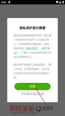 1、打开彩铃多多APP,弹出隐私保护指引概要,点击同意,确认接受隐私政策与用户协议进入首页。