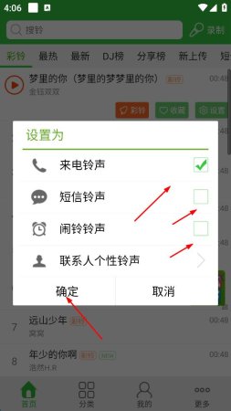 3、在设置为弹窗,选择来电铃声、短信铃声等所需铃声类型,点击确定,完成铃声设置操作 。