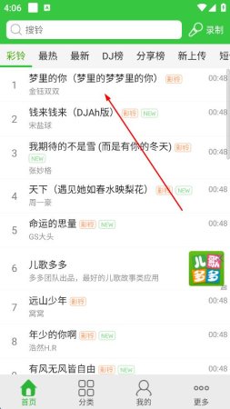 2、在首页彩铃列表,找到想设置的铃声如梦里的你,点击该铃声条目,进入铃声操作界面。