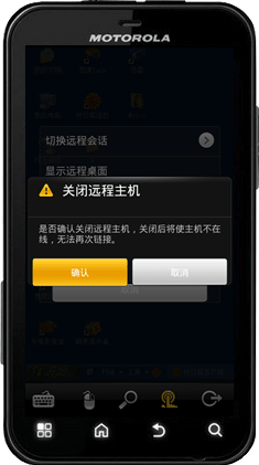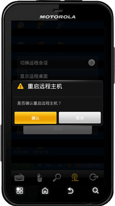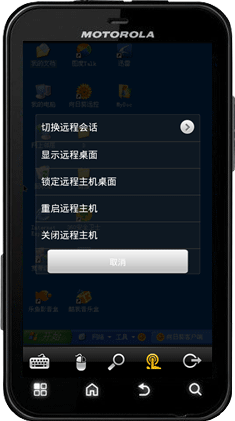 键盘、鼠标、缩放功能、退出都比较简单,分别可调出电脑键盘,调动电脑鼠标方便控制;可以根据自己的需求缩放屏幕;退出Android主控端。要说的就是功能键,点击“功能键”可进行切换远程会话、显示远程桌面、锁定远程主机桌面、重启远程主机、关闭远程主机操作。