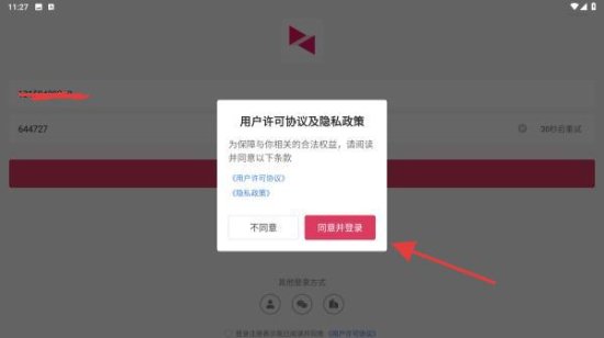 4、点击后,会弹出用户许可协议及隐私政策,点击同意并登录的按钮即可。
