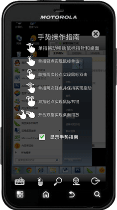 成功登录远程主机,将显示手势操作指南。向日葵Android版手机在手势操作支持单指拖动移动鼠标指针和桌面;单指轻点实现鼠标单击;单指两次轻点实现鼠标双击;单指两次轻点并保持实现拖动;双指轻点实现鼠标右键;开合双指实现桌面缩放等。