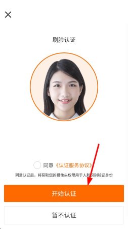 4、进入刷脸认证页面,勾选同意认证服务协议,点击开始认证,按提示完成实名认证。