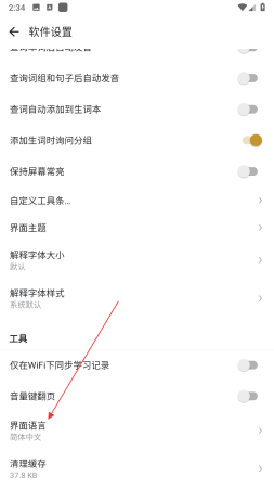 3、在软件设置界面里,找到界面语言选项,点击该选项进入语言选择页面。