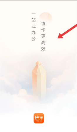 1、进入快乐平安app最新版平台欢迎页,了解一站式办公 协作更高效的功能定位,平台标识为快乐PINGAN。