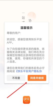 2、在进入登录的页面前,需要认真查看app弹出的温馨提示,阅读完毕后点击同意并继续的按钮,进入登入界面。