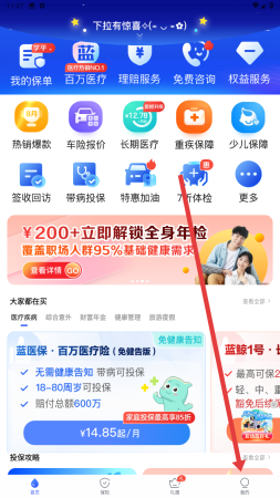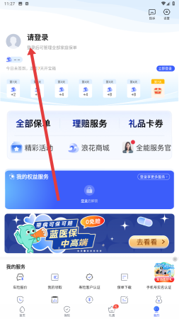 1、在太平洋保险首页中,可以点击右下角我的按钮,进入到我的主页中。
