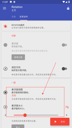 2、切换到按需旋转页面,能看到ROTATION服务提示,还有悬浮窗,适应方向等切换选项,以及悬浮窗视图,悬浮窗大小等一般设置,可根据使用习惯调整悬浮窗相关设置。