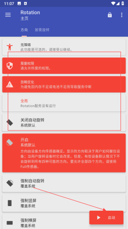 1、进入主页可看到无障碍,需要权限,忽略优化等提示,还有关闭自动旋转,开启,强制自动旋转等方向设置选项,根据需求选择方向设置,若要启动服务,点击启动按钮。