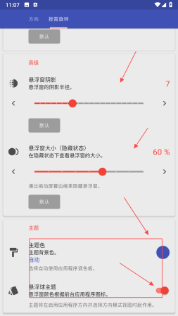 3、在高级设置和主题设置板块,可调整悬浮窗阴影,悬浮窗大小等高级选项,还能设置主题色,悬浮球主题,根据喜好进行设置,让软件界面和功能更符合使用需求。