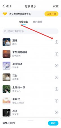 3、在背景音乐页面里,可以选择推荐歌曲列表中的歌曲如周深遥遥等,点击歌曲右侧+号将其添加为背景音乐。