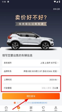 4、在卖车信息填写页面,继续填写上牌时间、行驶里程等车辆信息,确认无误后,点击预约卖车按钮,即可完成卖车预约操作。