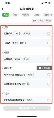 4、进入添加接种记录页面选择对应的疫苗名称及剂次,即可完成接种记录的添加。