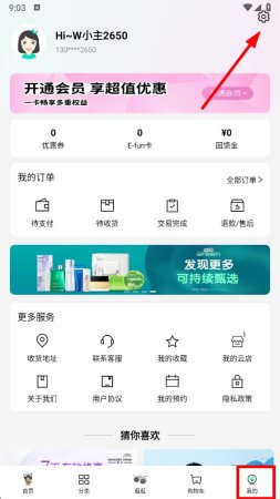 1、进入屈臣氏app,点击底部最右侧我的图标,在页面右上角点击设置图标进入设置界面。