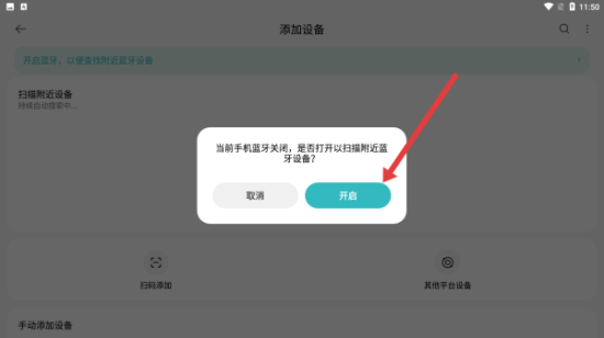 2、进入添加设备页面中后,可以点击开启蓝牙扫描附近设备进行添加。
