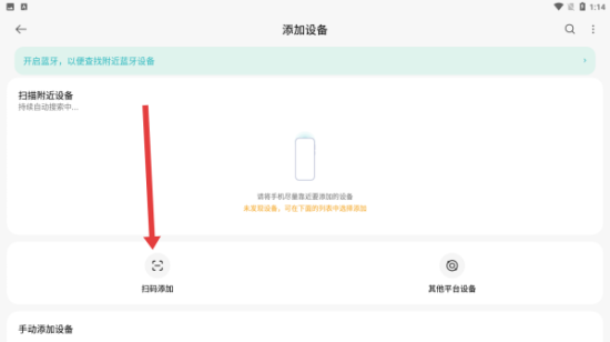 3、若蓝牙未扫描到可添加的设备,可以点击使用扫码的方式添加设备。