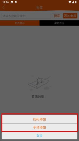 4、点击后会弹出添加方式选择框,可选择扫码添加,扫描电表上的二维码完成添加,或选择手动添加,手动输入电表相关信息进行添加。