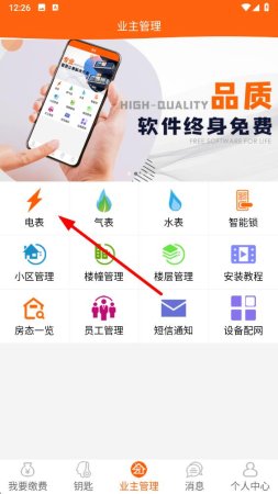 1、打开租宝APP,进入业主管理页面,点击电表选项,进入电表相关操作界面。