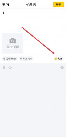 2、在写说说页面中,找到并点击右下角的公开按钮,进入谁能看见的权限设置界面。